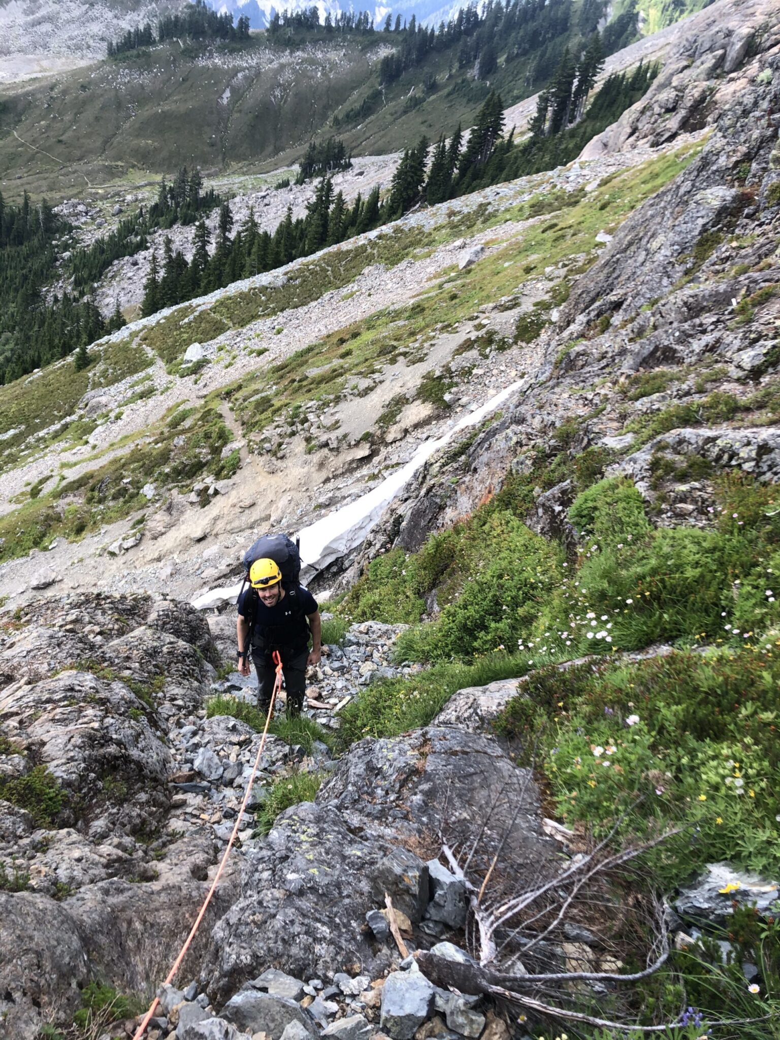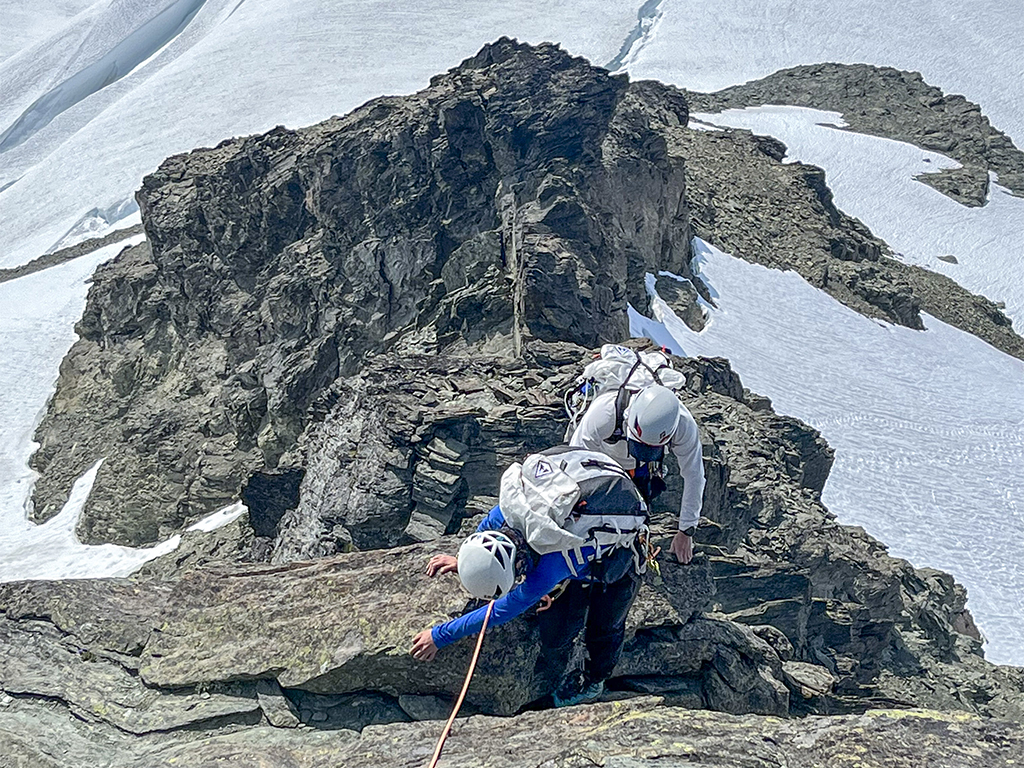 In order to safely complete this climb, there are several requirements you must meet. Climbers must ascend 3rd and 4th class rock, and a short pitch of steep snow or ice, depending on conditions. Climbers will need to rappel on the descent. Alpine rock climbing has challenges in addition to what is indicated by just the climbing grade. This is a long and committed route. Participants must be able to conduct themselves safely, even in adverse conditions. Please consider joining us for our 1-Day Alpine Rock Skills Training if you do not feel comfortable with rock safety basics.